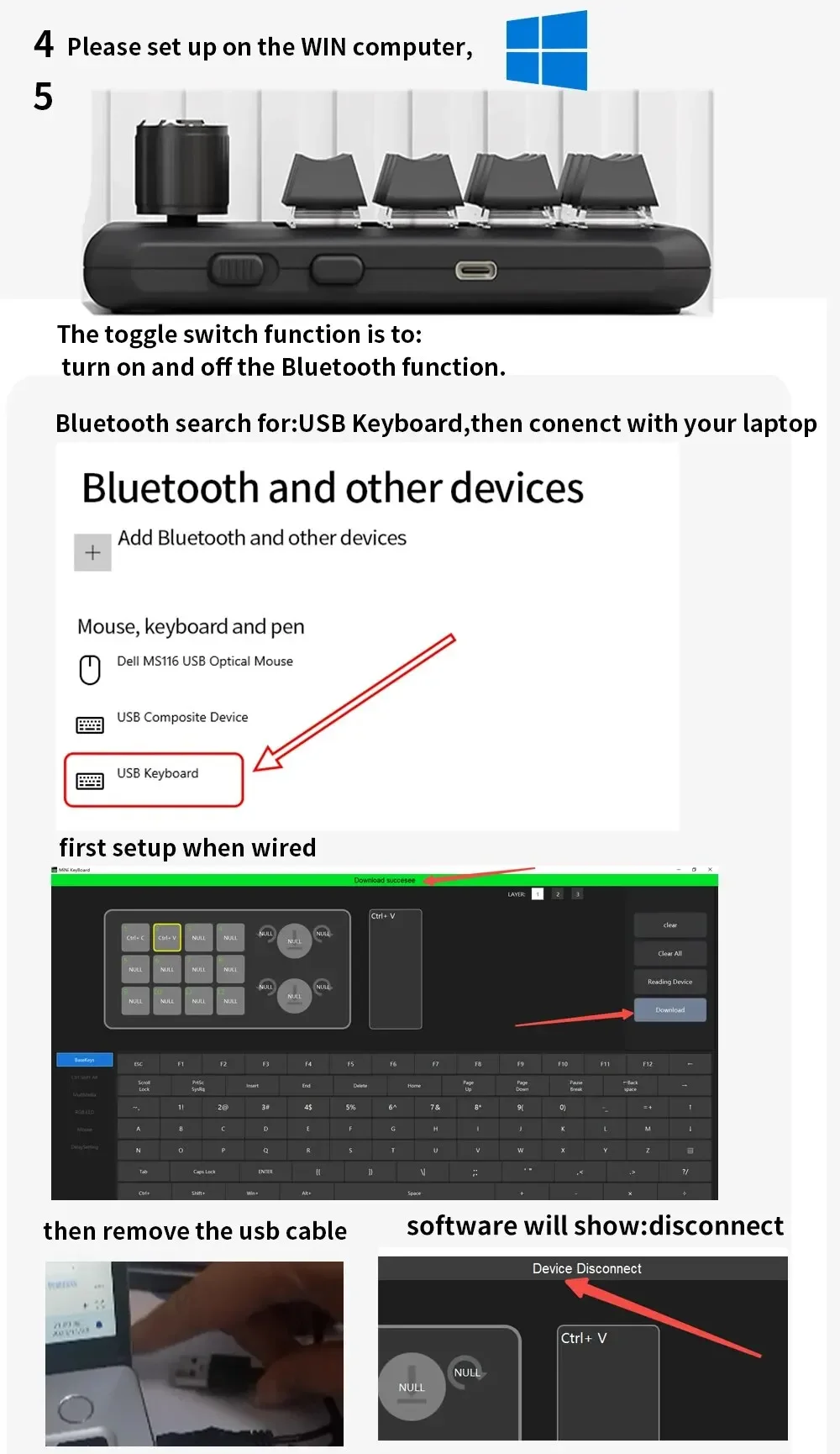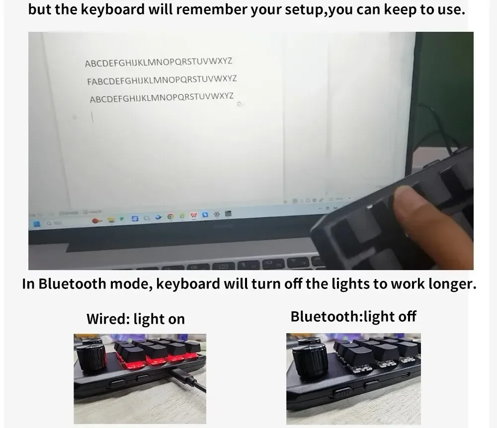 8. If need to use Bluetooth function,please first setup when wired, then connect via Bluetooth, un-wired, software will show: disconnect but the keyboard will remember your setup, you can keep to use. In Bluetooth mode, keyboard will turn off the lights to work longer.