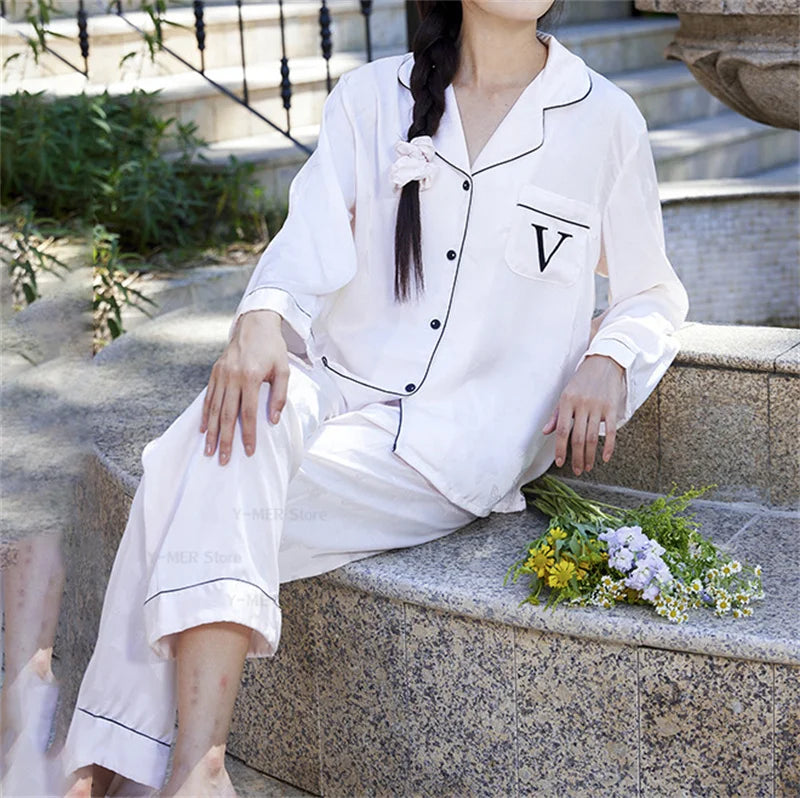 2025 Women Stripe Print Satin Pajama Ladies Pyjamas Loungewear Set Long Sleeve Buttons Lapel Tops & Pants Pijamas De Mujer