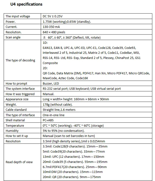 Supports the reading of paper barcodes, LCD display barcodes, mobile phone screen barcodes, anti-color barcodes, and non-standard barcodes such as print distortion and wrinkle breakage.