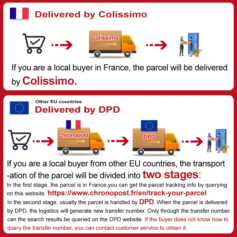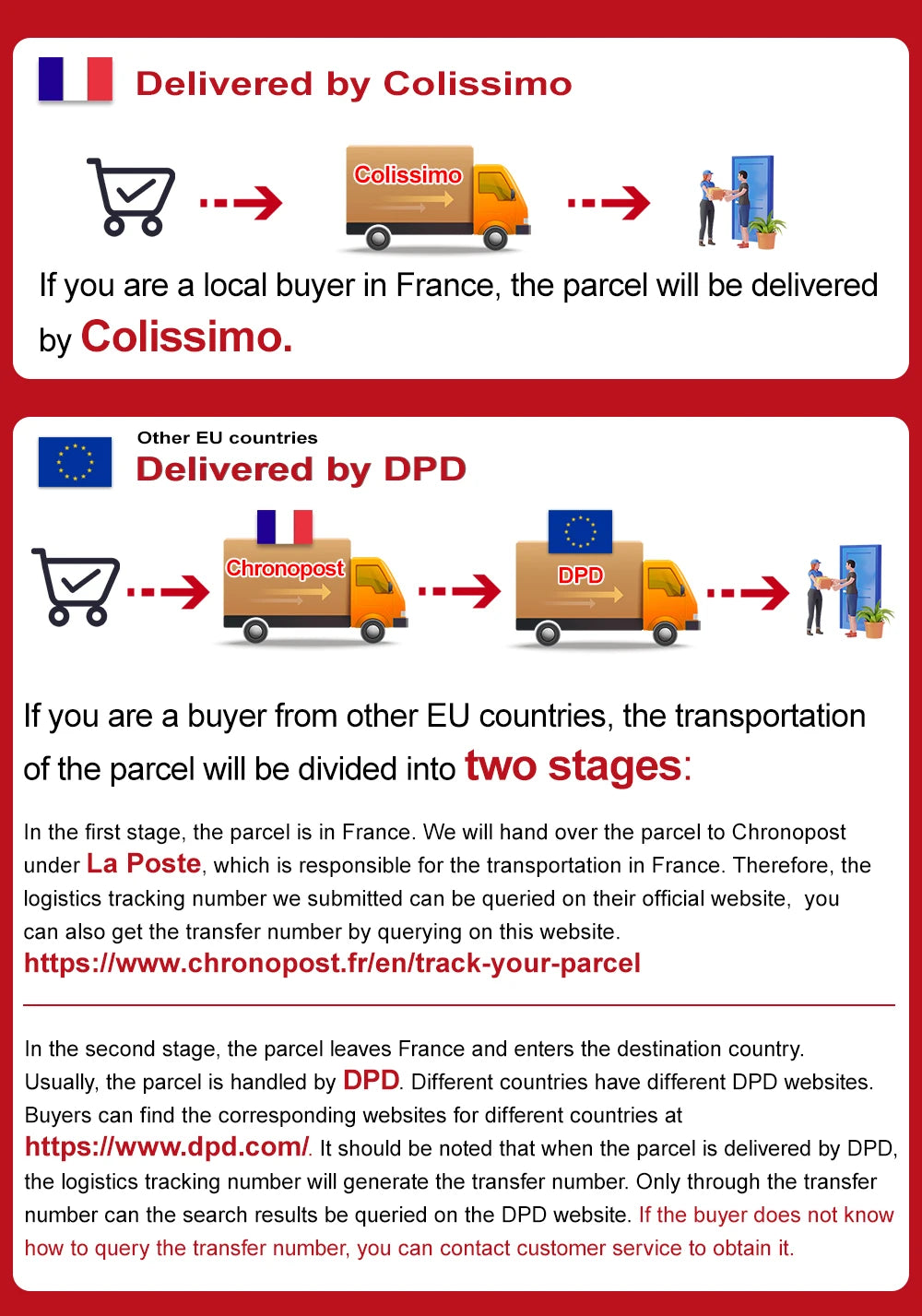 In the second stage, the package leaves France and enters the country of destination. In General,The package is supported by DPD. Different countries have different DPD websites. Buyer can find corresponding websites for different countries onhttps://www.dpd.com/. It should be noted that when the package is delivered by DPD, the logistics tracking number generates aNew transfer number.Only through the transfer number can search results be interviewed on the DPD website.If the buyer does not know how to query the transfer number, you can contact the customer service to get it.