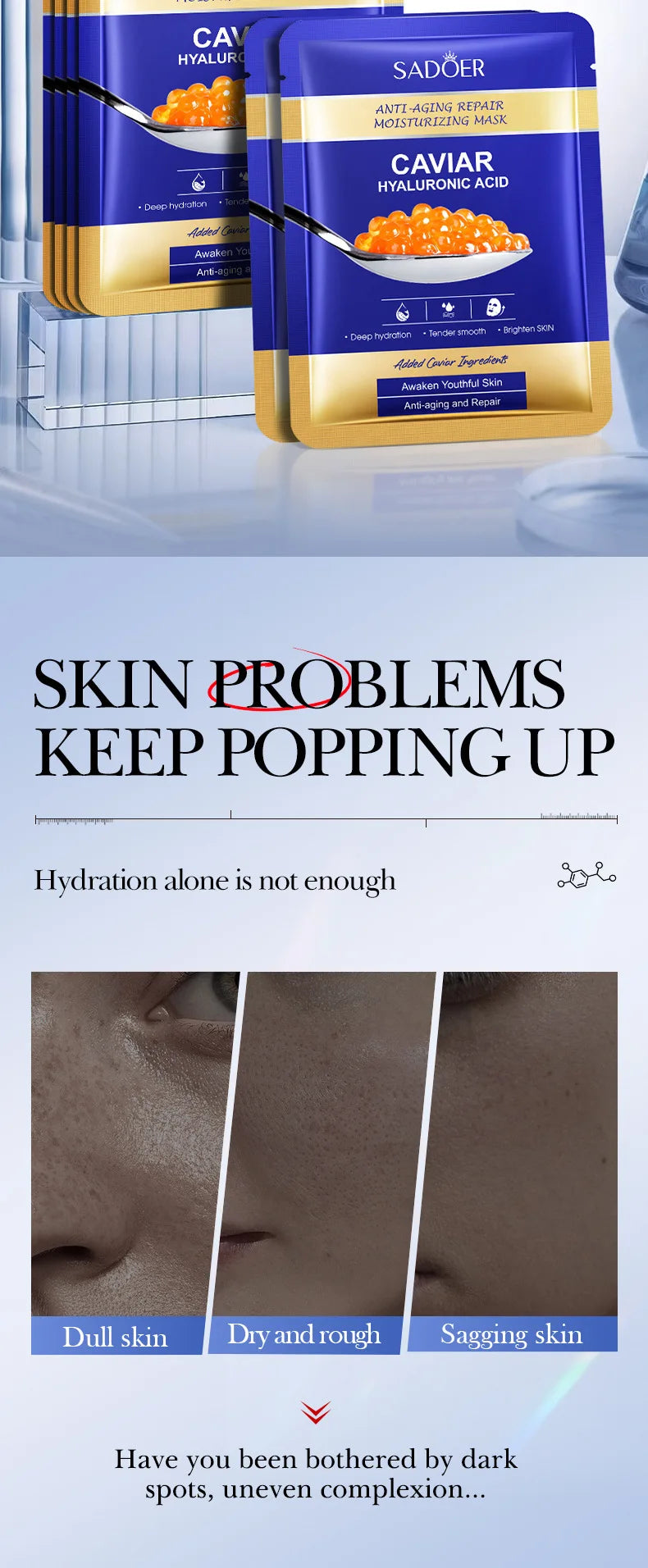 5pcs SADOER Caviar Hyaluronic Acid Moisturizing Facial Masks Brightening Firming Hydrating Face Mask Facial Skin Care Products