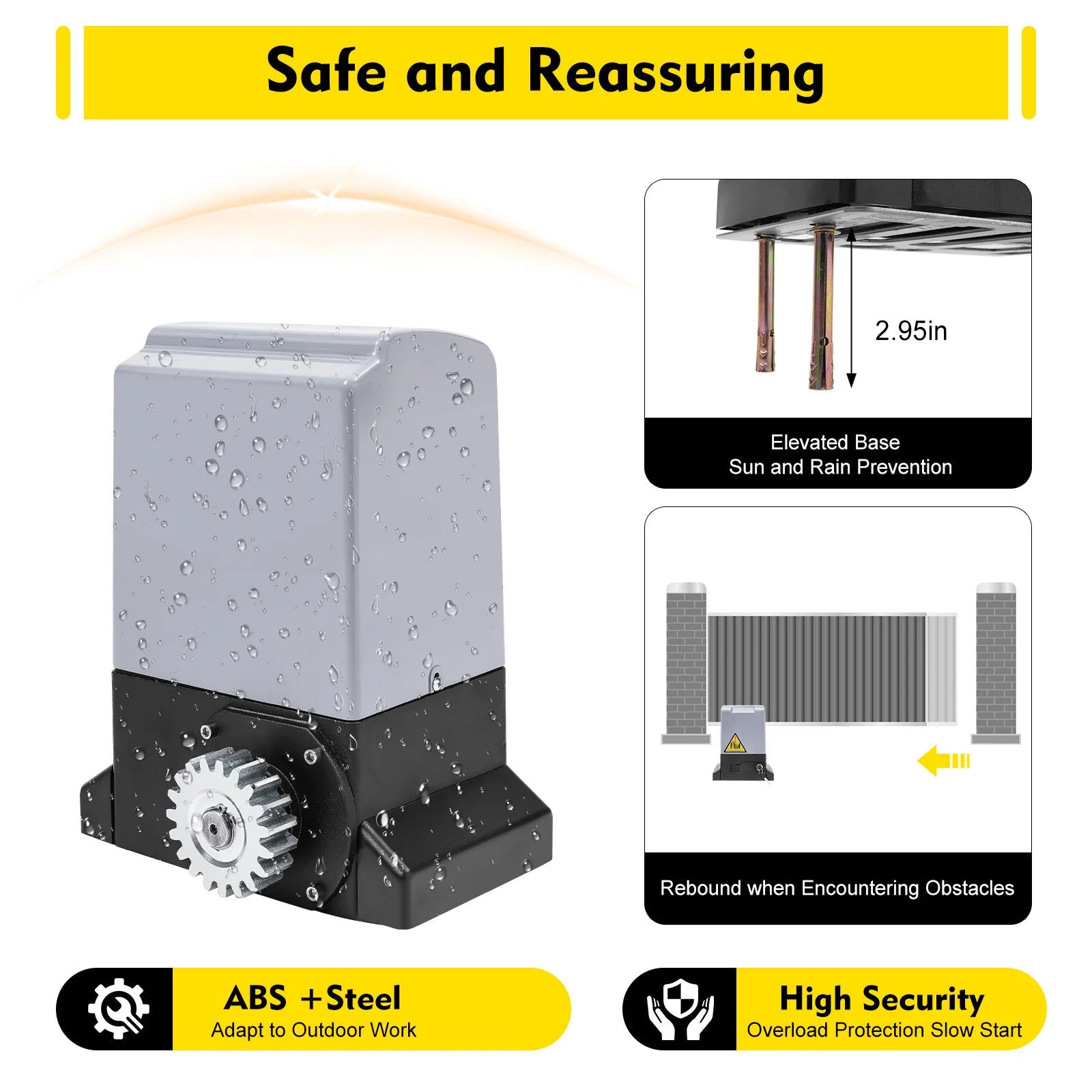 Powerful Function: This sliding gate opener uses a maximum power 750W motor and its high-quality chain to smoothly slide a maximum of 3527lbs or 39.3ft gate at a speed of 39.3ft per minute.