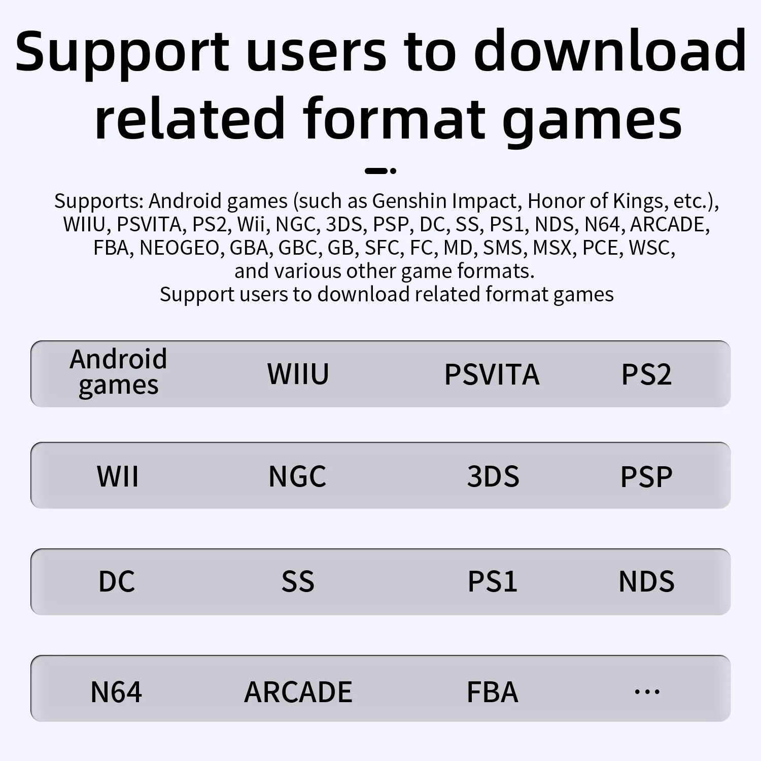 - Versatile Gaming: Runs Android 14. Supports RixelHK for game downloads. Compatible with Android games (like Genshin Impact, Honor of Kings) and numerous emulators: WIIU, PSVITA, PS2, etc.