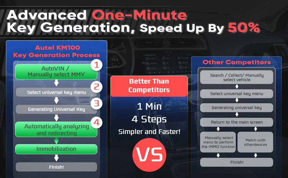 As shown in the above two pictures, we can see that compared with other compatitors, Autel 2023 KM100 Key Fob Programming Tool has greatly simplifies key generation process for better user experience. Only 1 Min, 4 Steps, Speed up by 50%, you can generate a I~KEY, helping you save more time and win more business.