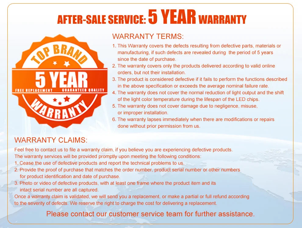 4.The warranty does not cover the normal reduction of light output and the shift of the light color temperature during the lifespan of the LED chips.
