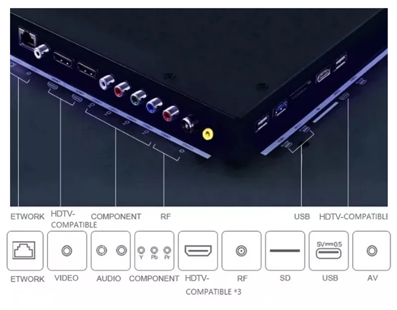 usb, Composite A/V, HDTV input, RF input, RJ45 input |