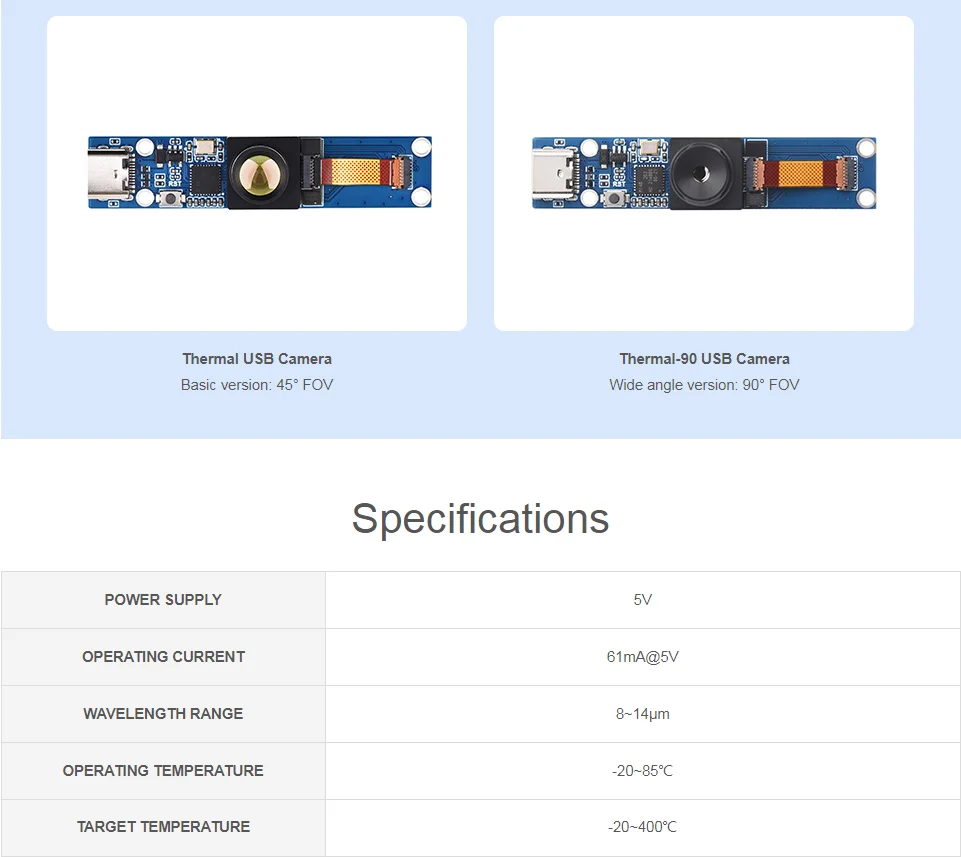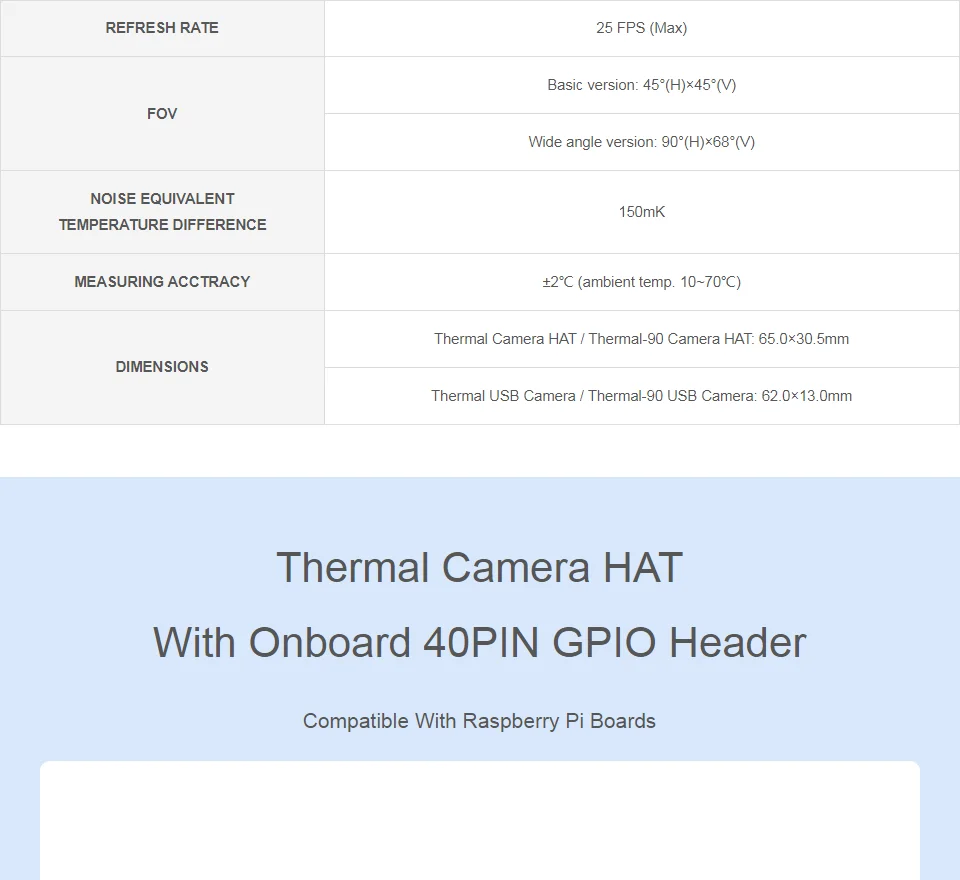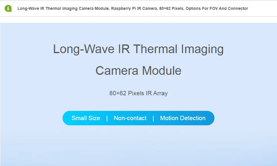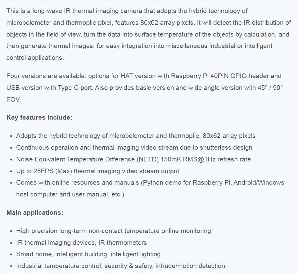 Long-wave IR Thermal Imaging Camera Module, Raspberry Pi IR Camera, 80×62 Pixels, Options for FOV and Connector