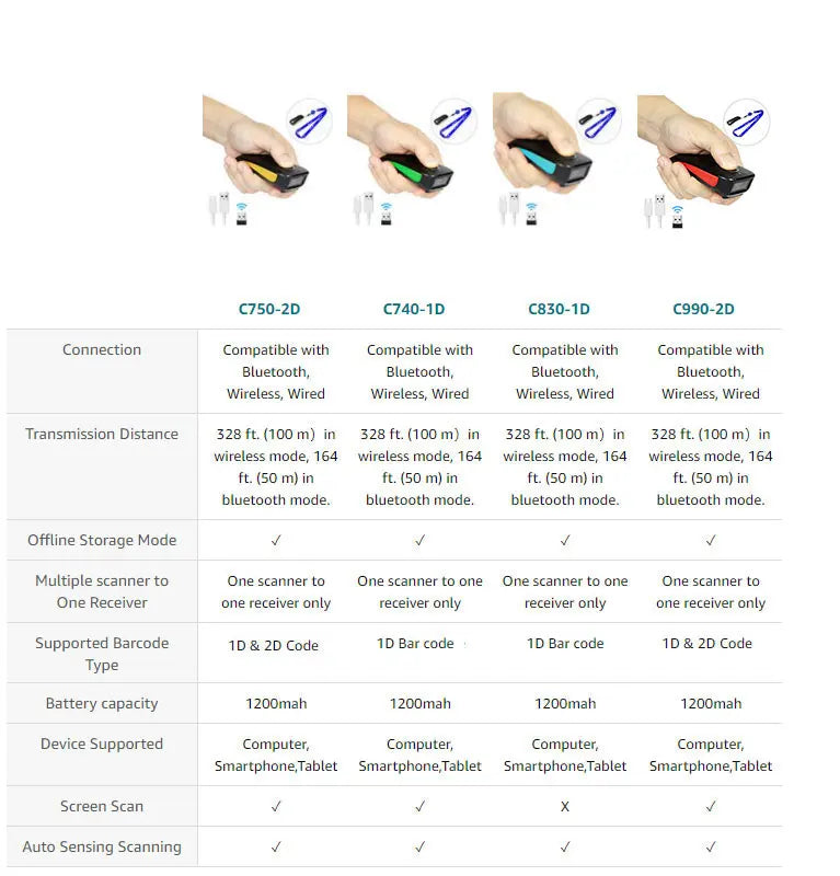 3-in-1 Connection Design The Pocket bar code scanner comes with 3-in-1 Connection Design:Compatible with Bluetooth Function; 2.4G Wireless connection receiver; Wired connection.
