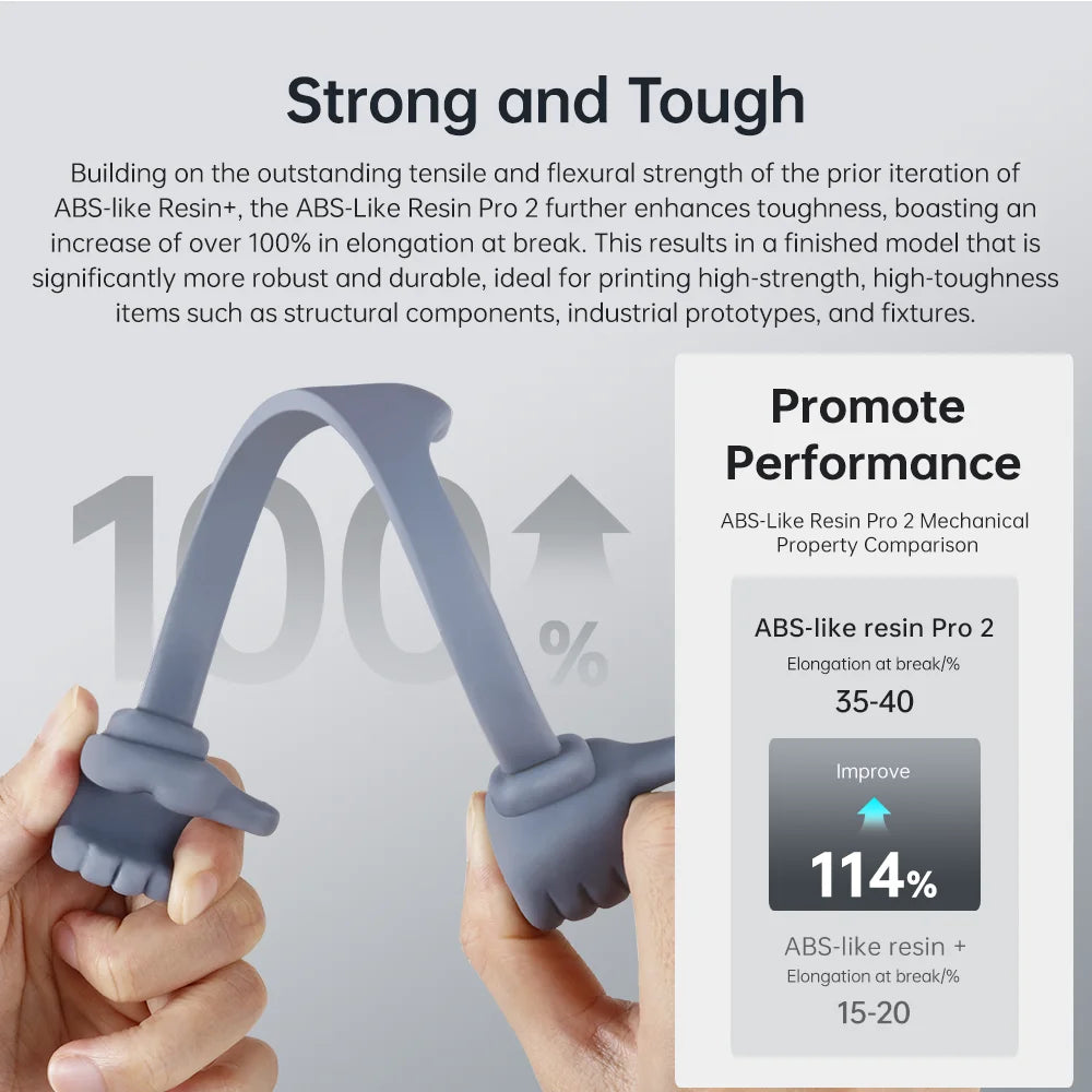 Based on the excellent tensile and bending strength of the previous version of ABS-like resin + , Anycubic ABS Pro 2 strengthens the toughness performance, increases the elongation at break by more than 100%, and the finished model is stronger and more durable, which can be used to print high-strength and high-toughness models such as structural parts, industrial prototype parts, and fixtures.