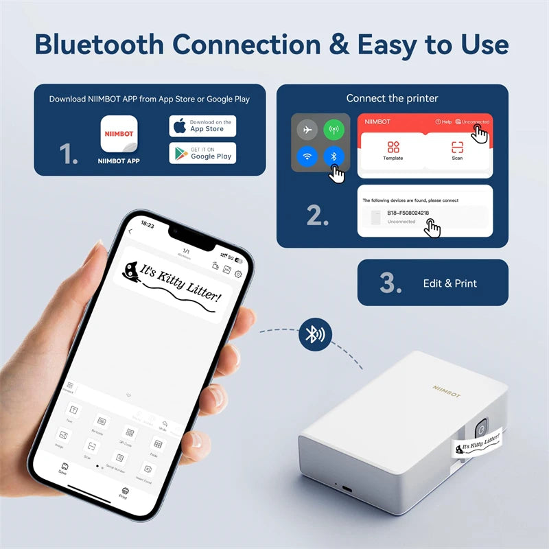 • Bluetooth Connectivity :The Niimbot B18 mini label maker features Bluetooth connectivity, allowing you to print labels wirelessly from anywhere within range.