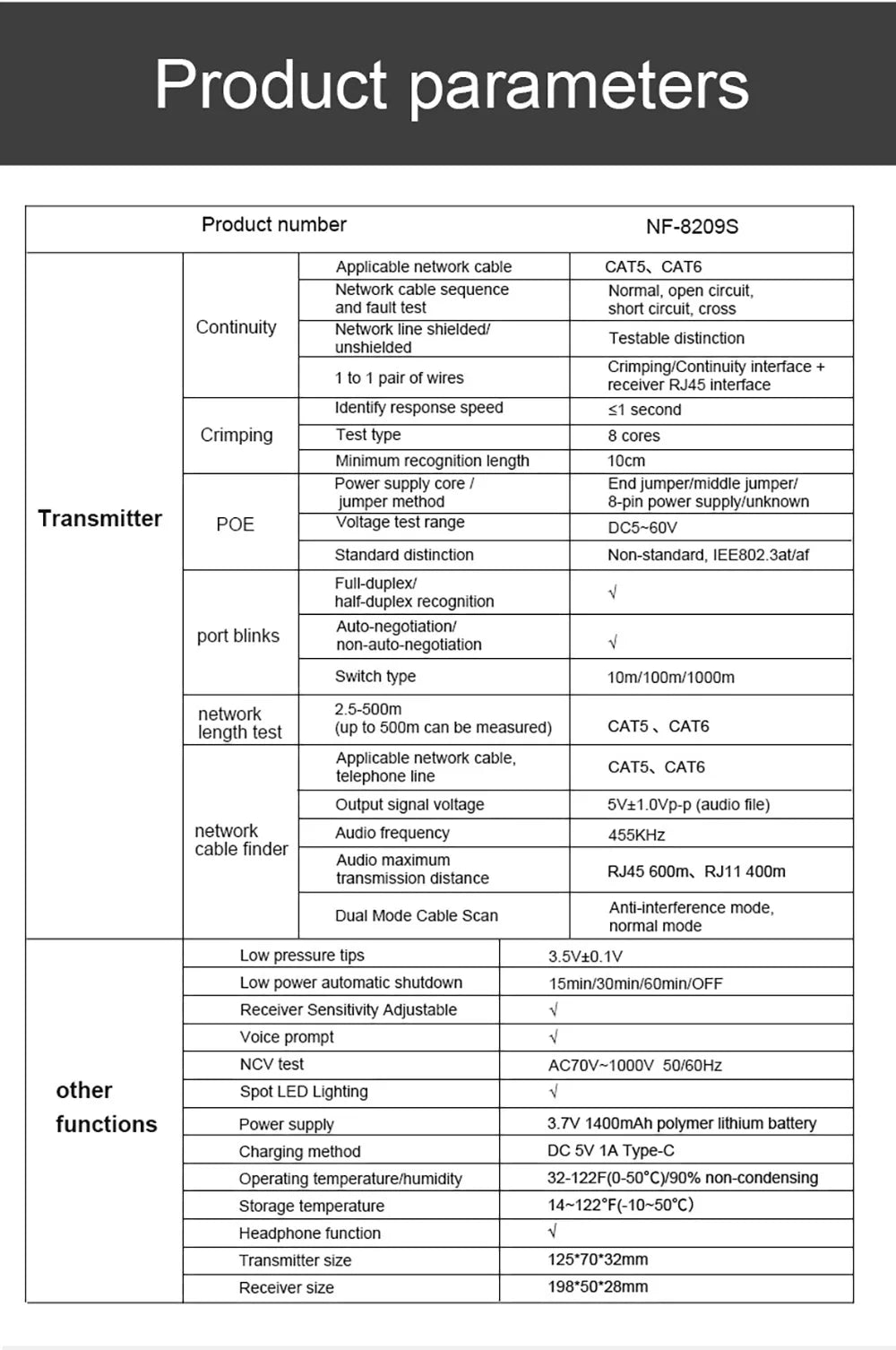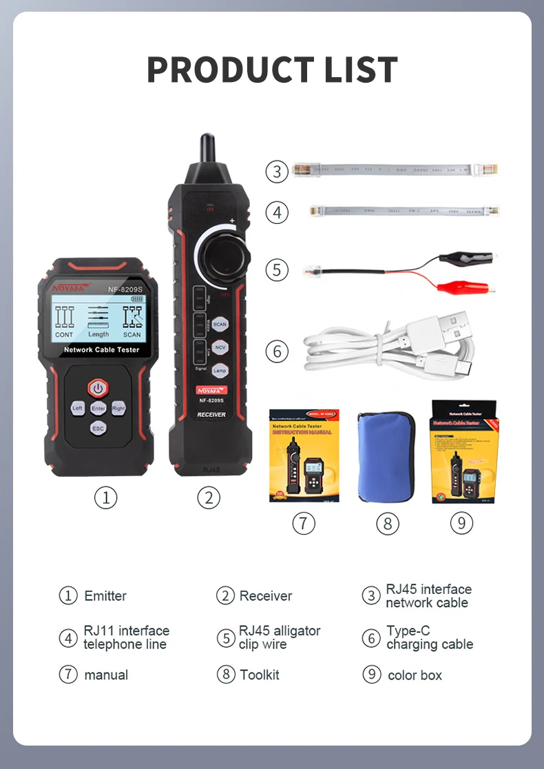NF-8209S network cable tester adopts digital signal receiving and decoding technology, which has a higher anti-interference degree and is more accurate, and eliminates false alarms. At the same time, it has functions such as ordinary line hunting, anti-interference hunting, line alignment, length test, POE test, port flashing, Crimping test, NCV induction pen and other functions, which can meet the needs of users to a greater extent and improve work efficiency.
