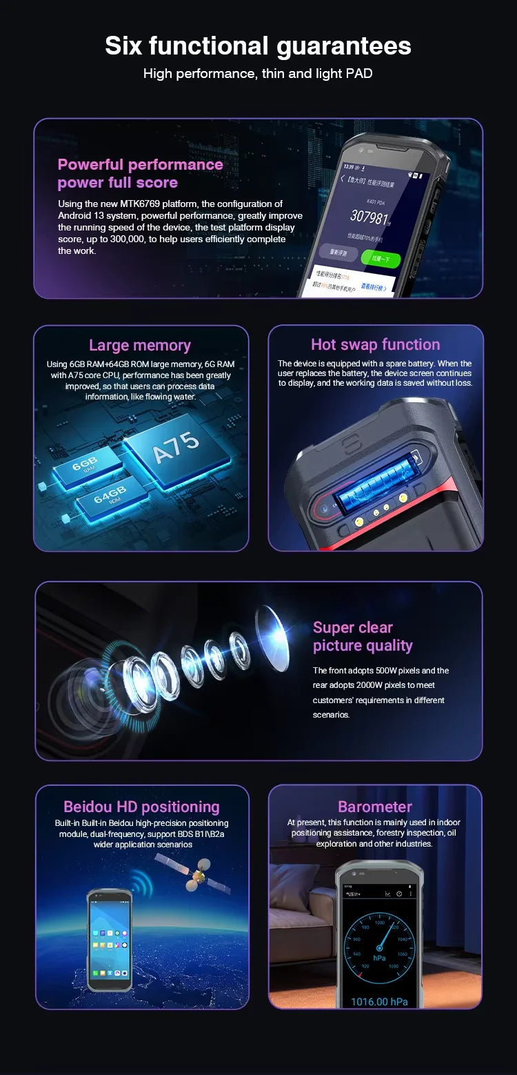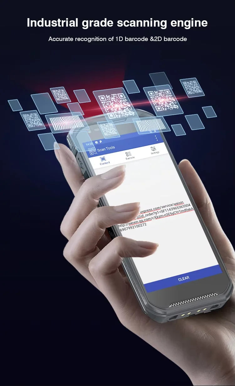 This product link included:Android13+6GB RAM 64GB ROM+2G/3G/4G+WIFI+BT+Camera+GPS+1D/2D Barcode Scanner
