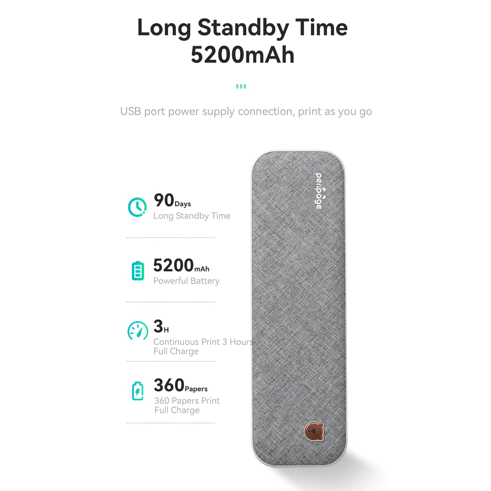 【Convenient for Your Life】 With compact size - 265x80x45mm/10.4x3.1x1.8in. Built-in 2pcs 2600mAh rechargeable batteries, which can continuous print 3hrs after full charged, long standby time of 90 days, great for carry to business travel, school etc. You can print invoices, contracts, lists and exam documents contracts on site with your phone or computer.