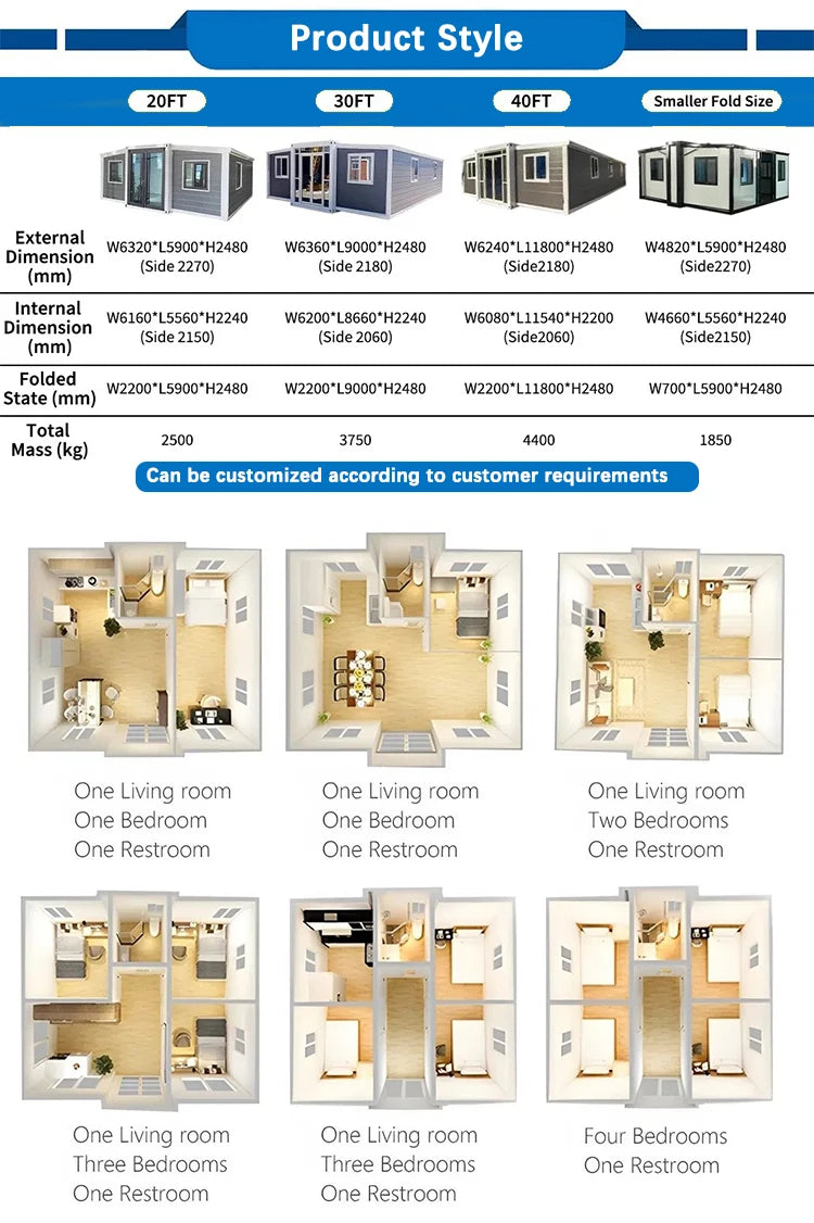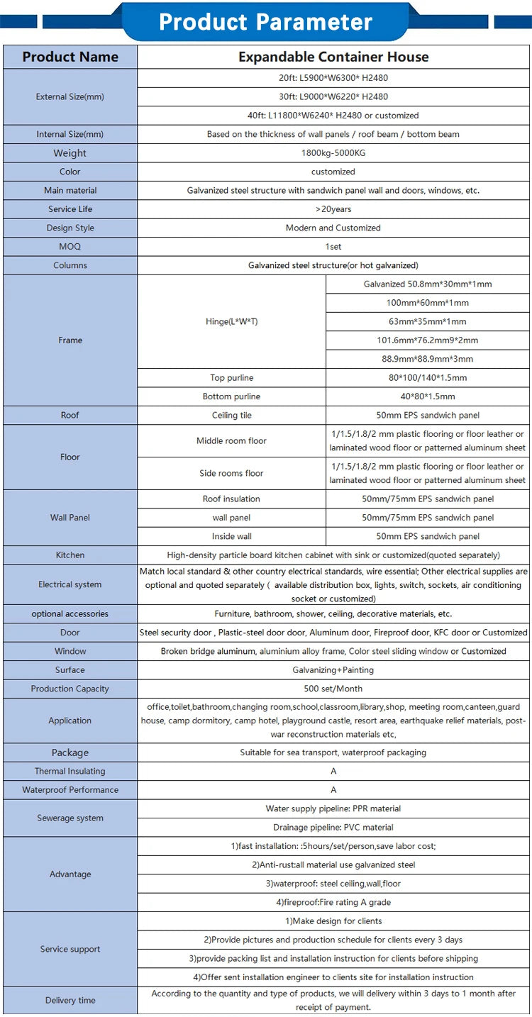 The expandable house adopts an expandable structure, which increases the available space of the house after expansion, creating a larger living space; The appearance and spatial layout appear unique and can be freely customized according to customer requirements; Can be quickly assembled and disassembled, facilitating relocation to different locations; Whether it is for home living, business office, or emergency rescue, expandable housing can provide convenient living solutions
