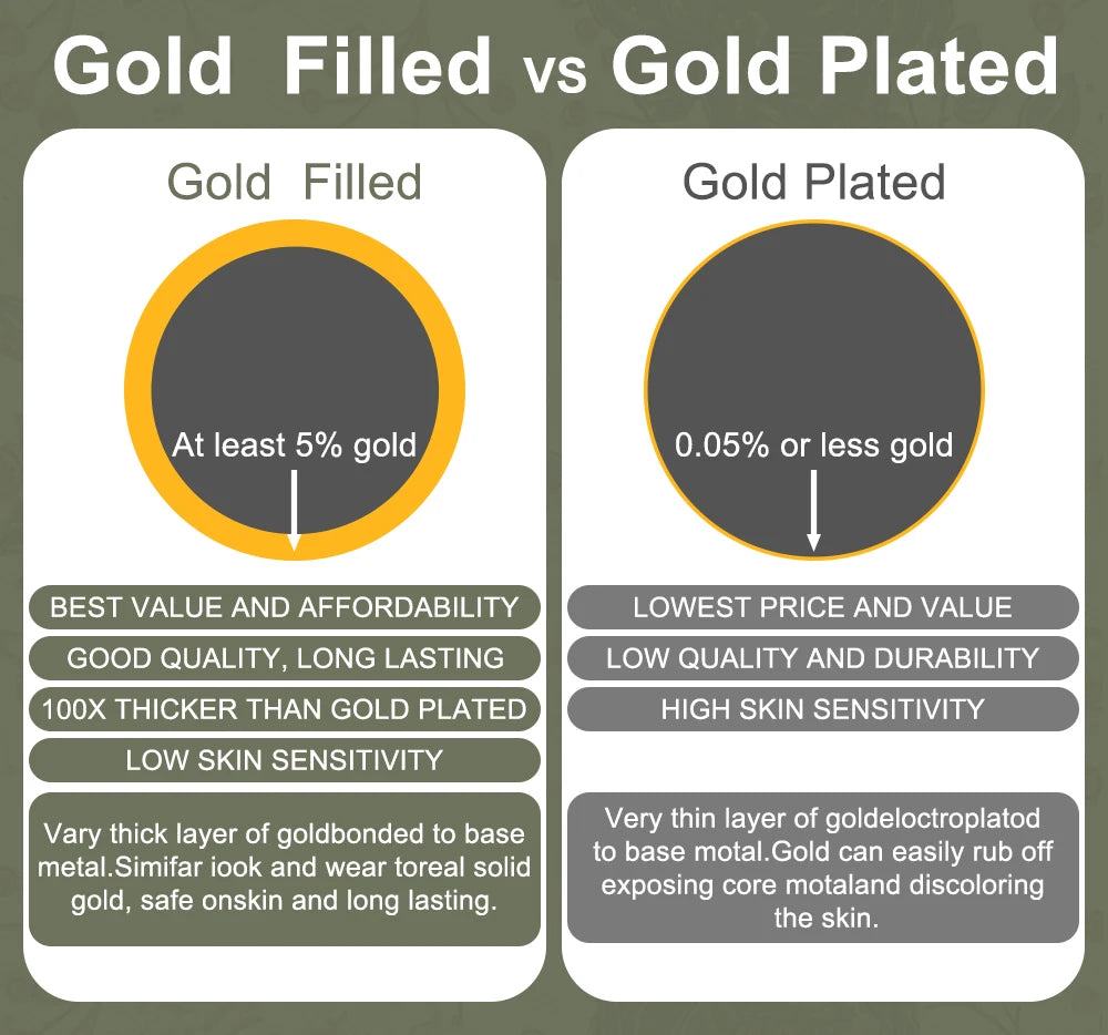 Electroplat-ing is a very thin layer of gold which may tarnish quickly.Gold filled jewelry has inherent value in 5%