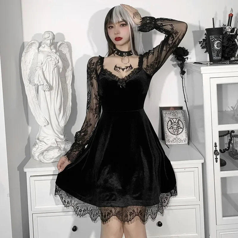 Robe Gothique en Velours et Dentelle pour Femme, Bretelles Spaghetti, Punk, Mini Cami, Costume de ixCosplay
