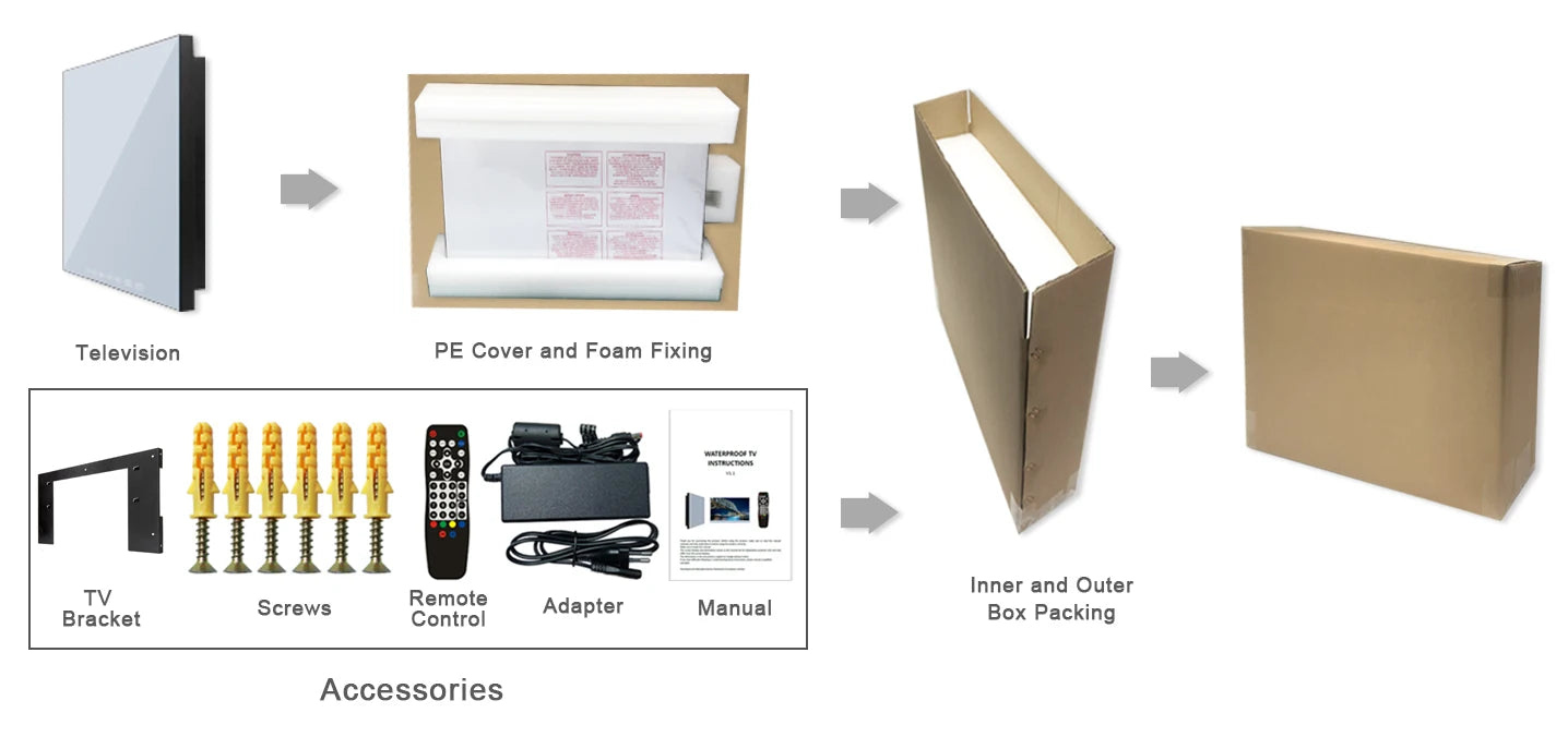 The waterproof TV is a completely sealed design, engineered for use in wet areas. It is rated IP65 or higher and can withstand not only moisture, but also water from any direction.