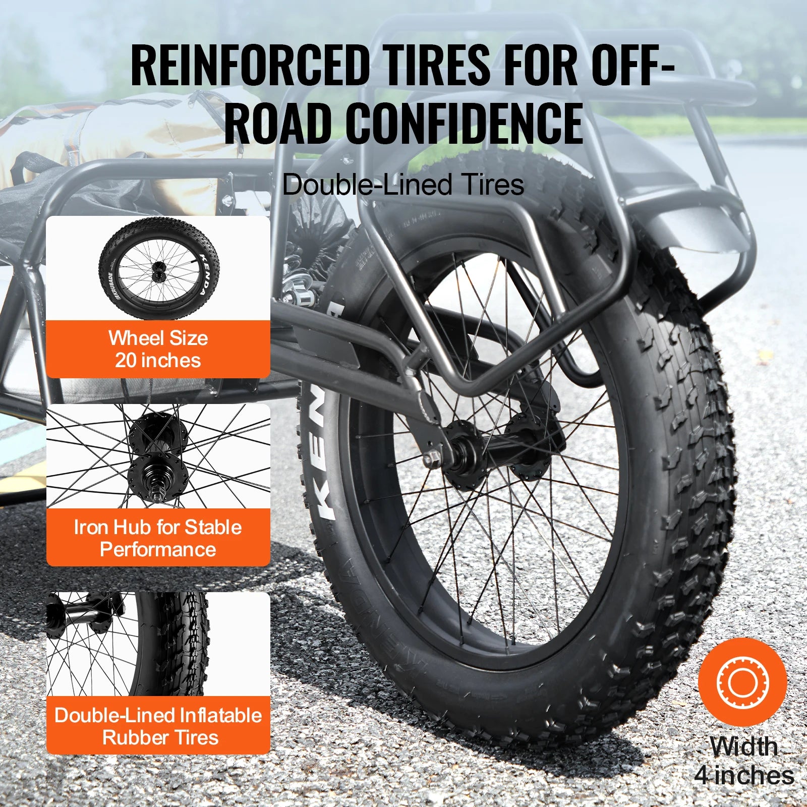 With a sporty tire and iron hubs, this bike trailer keeps you steady on any terrain. Whether you're cruising on pavement or hitting the trails, you'll stay on track.