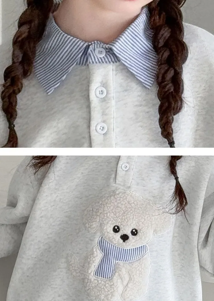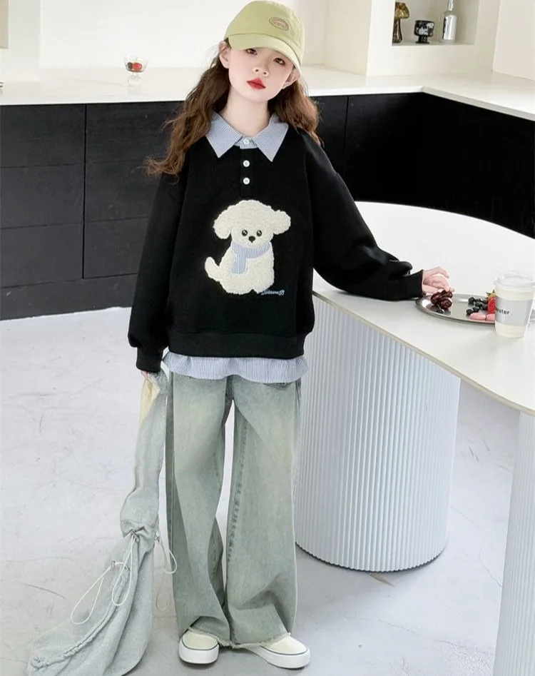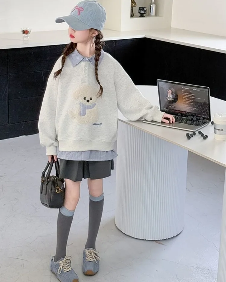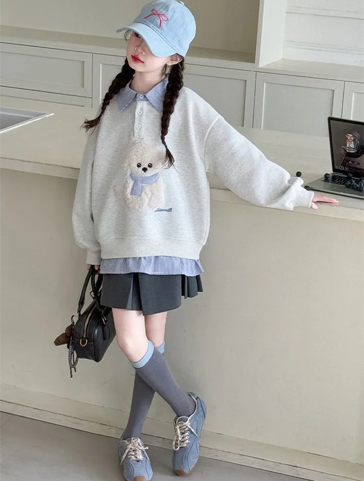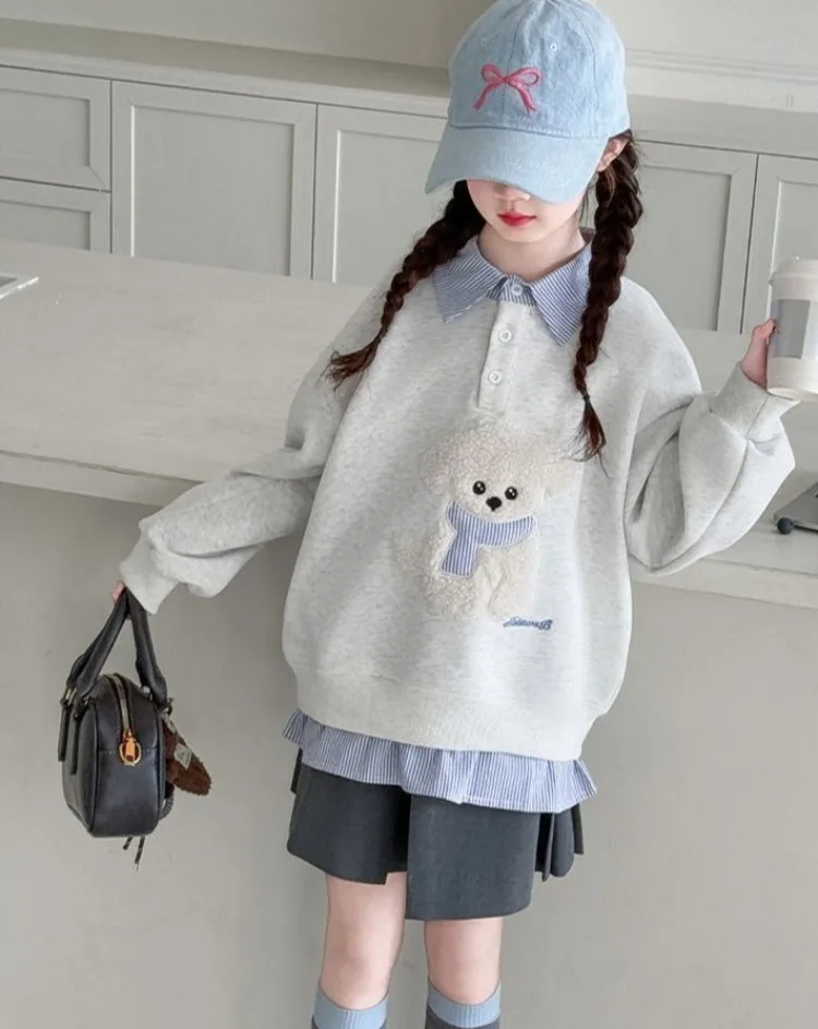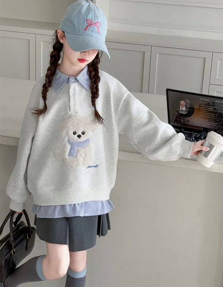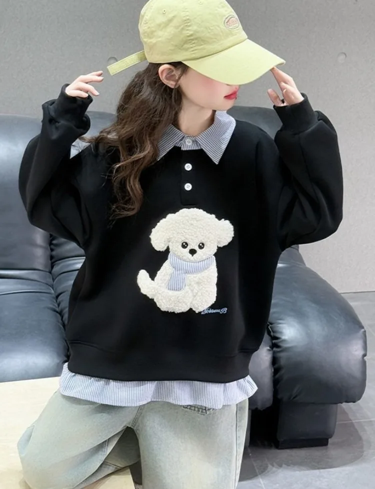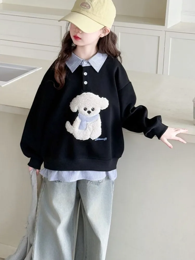 Sweatshirt Girls' 2025 New Faux Two-Piece Polo Hoodie Spring/Autumn Kids Medium-Large Loose Fit Cartoon Puppy Top