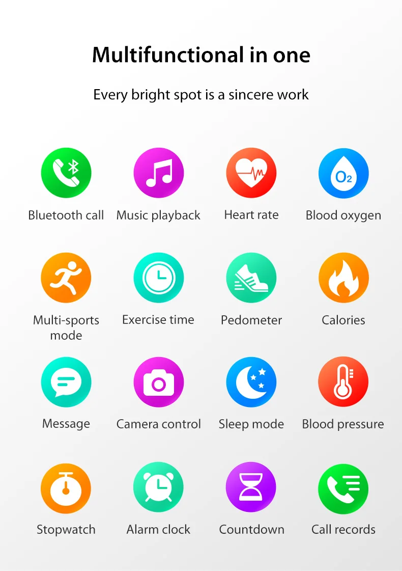 function: chronograph,THERMOMETER,Calendar,Alarm Clock,WORLD TIME,Remote Control,Countdown,Sleep Tracker,Speed Measurement,Calculators,Call Reminder,Answer Call,Mood Tracker,Message Reminder,Dial Call,Heart Rate Tracker,Moisture Measurement