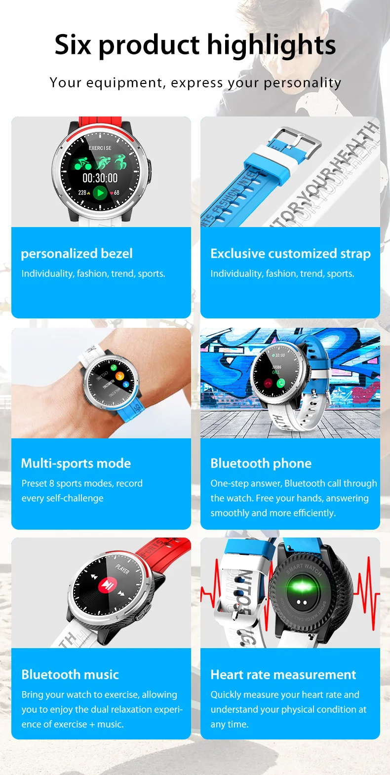 Answer Call, Push Message, Mood Tracker, Message Reminder, Dial Call, Heart Rate Tracker, Interactive Music, 24 hour instruction,