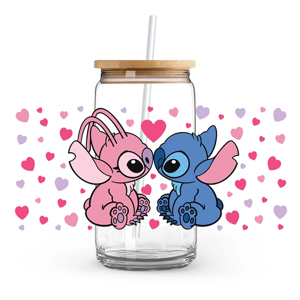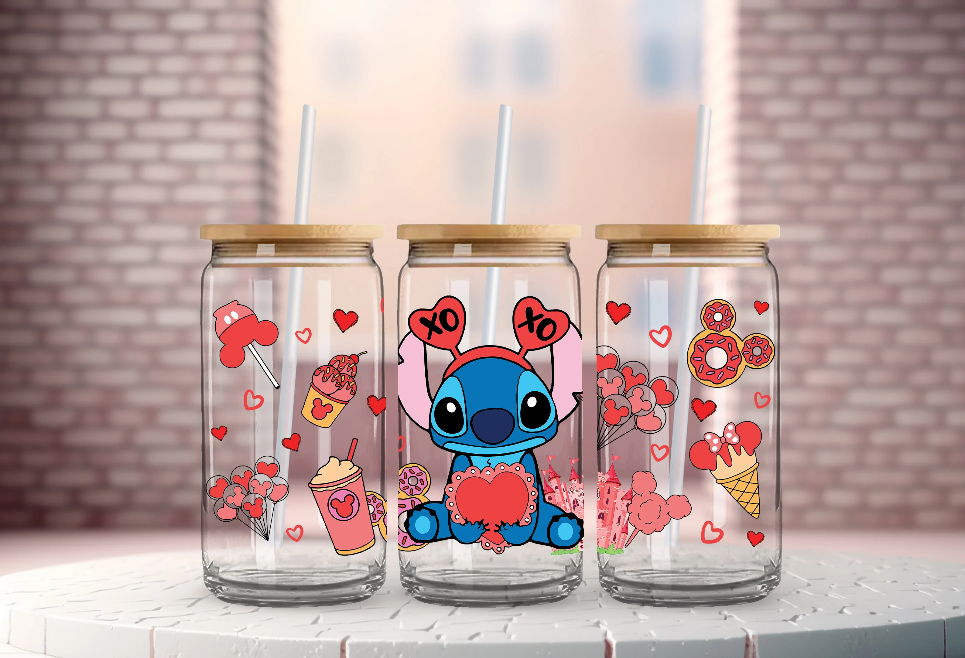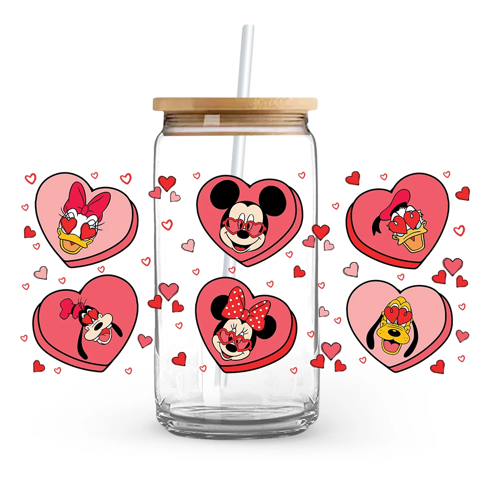 Valentine's Day cartoon Mickey Minnie Stitch Love 16oz Glass Cup UV DTF Transfer Film High-Quality Wraps Transfer Decals