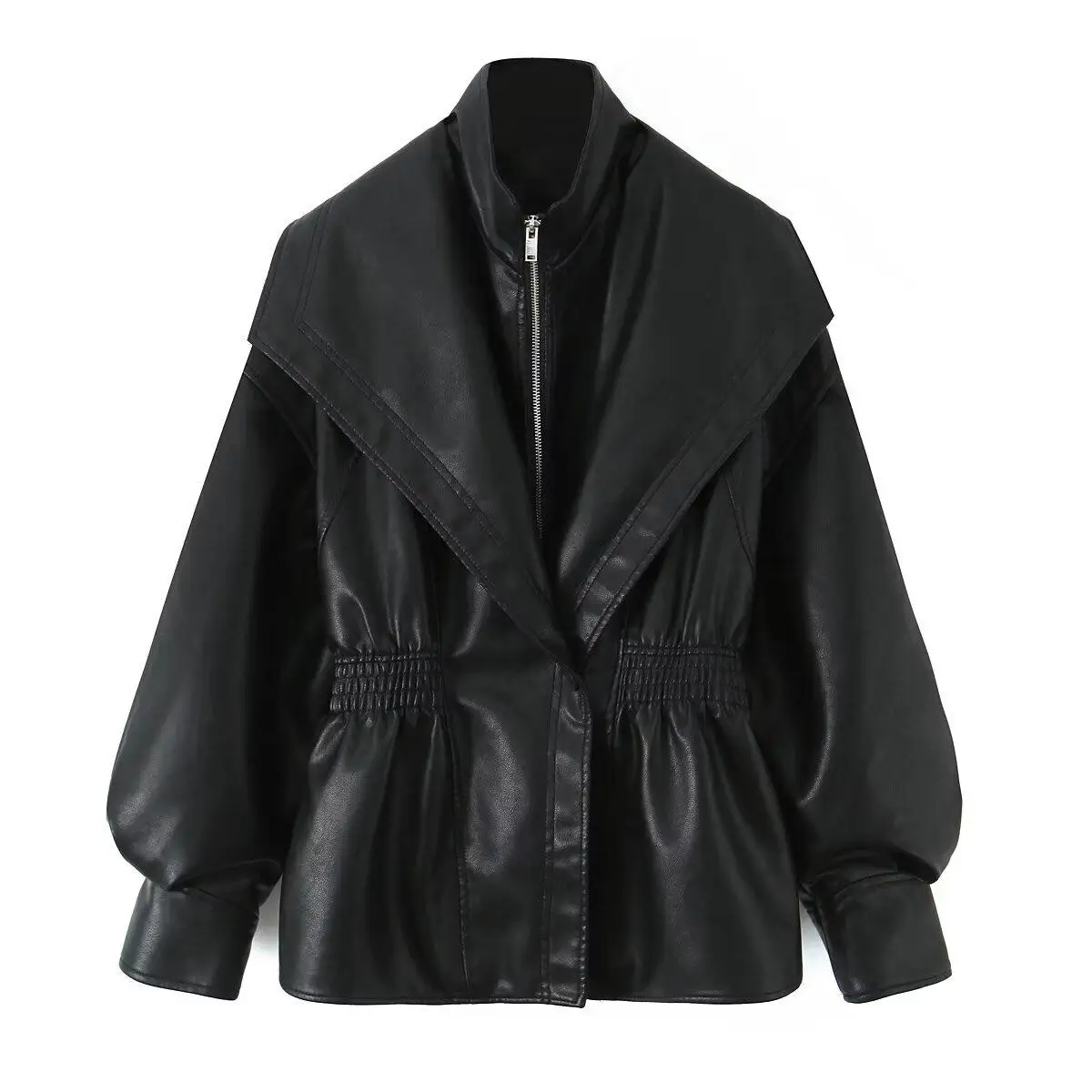 Veste en cuir marron à taille élastique pour femme, style décontracté, col à revers et fermeture éclair, collection automne-hiver.