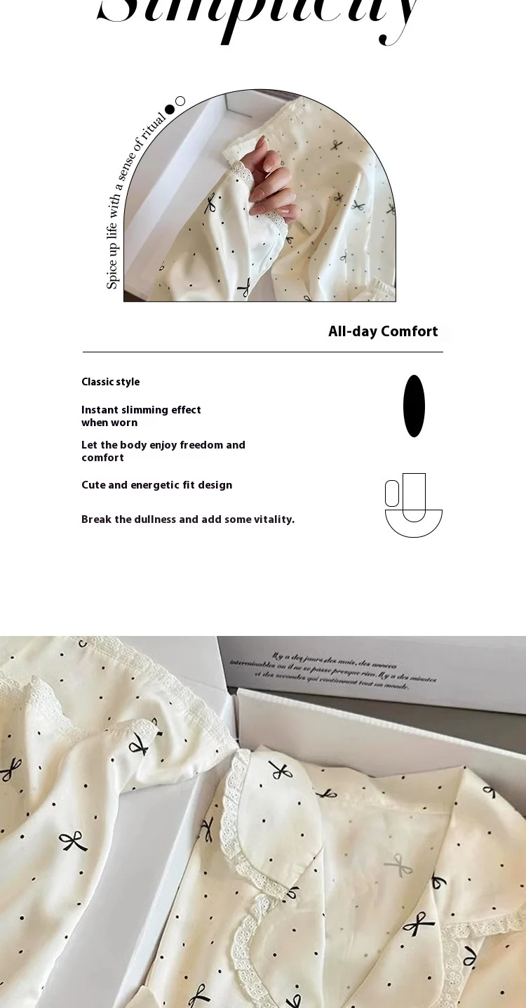 French-Inspired Chic, High-Fashion Aesthetic Instagram-Worthy Bow-Adorned Ice-Silk Lace-Trimmed Long-Sleeved Trouser Pyjamas