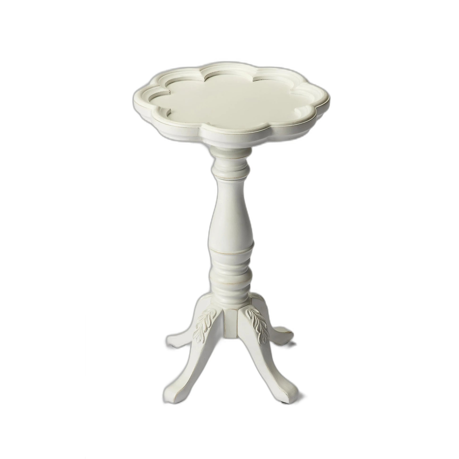 Distinctive in style the 20" cottage white wood floral top end table radiates a versatile charm. Offering a nice color combination, the top of this manufactured wood table is cottage white, while the base compliments it nicely in white. The purposefully distressed finish gives this table an authentically rustic feel. An ideal location for placing your snacks and drinks, and a place to keep your lamp, frames, or other accessories. This versatile table is a great accent for most any room. 20" H x 12" W x 12" D