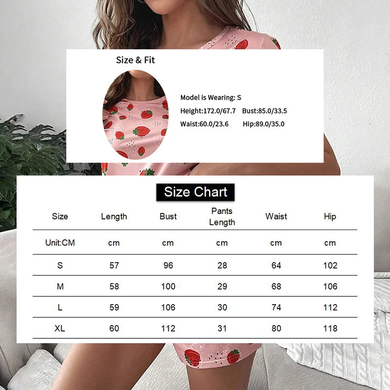Pajamas Set for Women Breathable Strawberry Print Sleepwear Comfy Short Sleeve Top and Shorts Pyjama Home Loungewear for Ladies