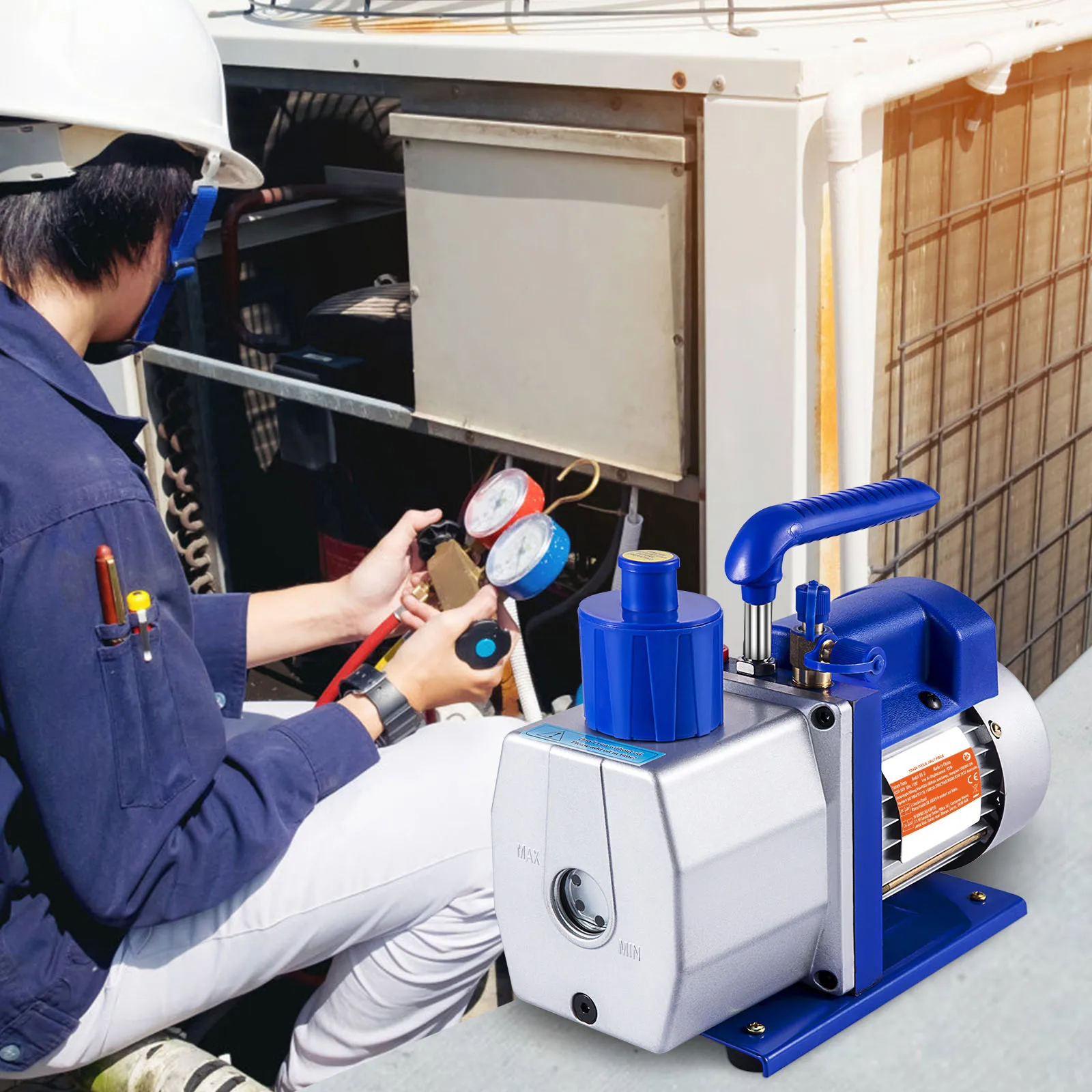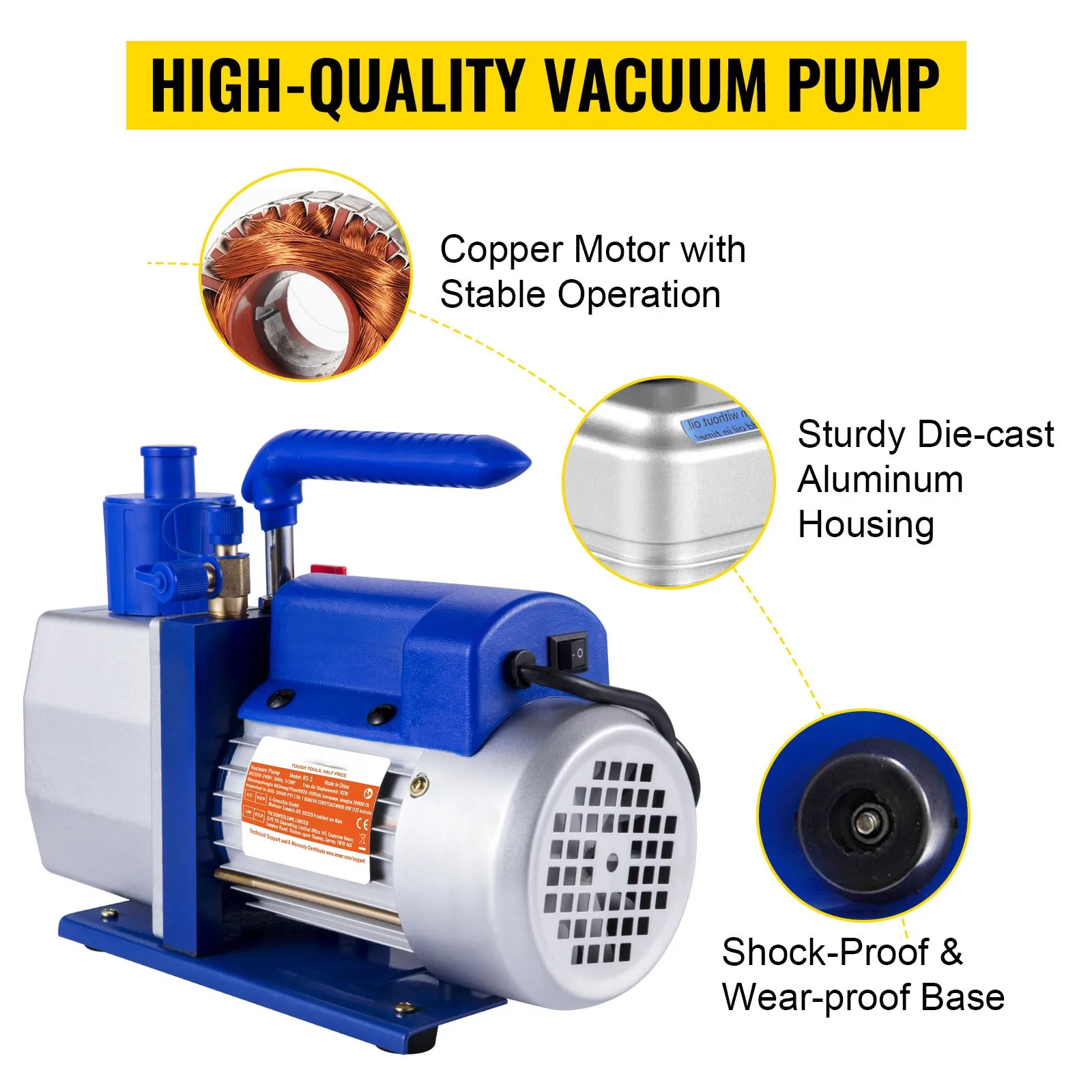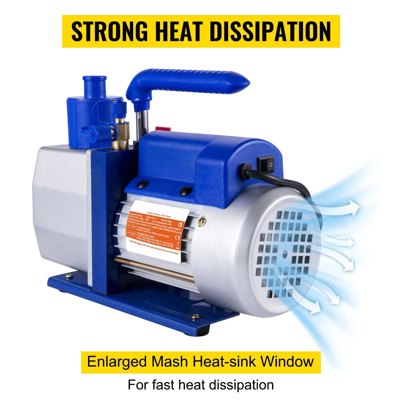 Heavy Duty Vacuum Pump: FAD: 7 CFM, Single Stage; Power: 1/3 HP. Our HVAC vacuum pump comprises heavy-duty aluminum alloy with durability and sturdiness. The strong copper motor provides continuous power, and a shock-proof base supports the stable operation.