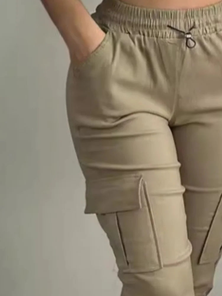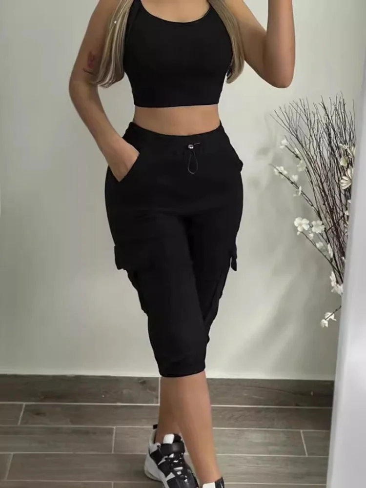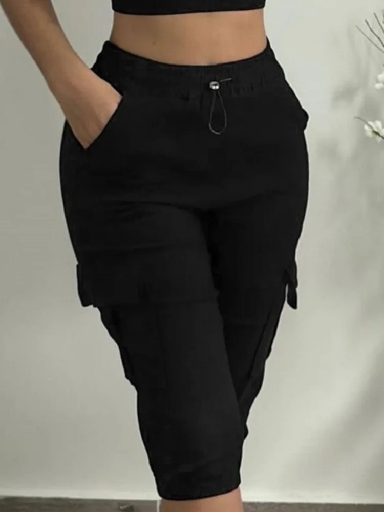 Pantalon Capri slim d'été pour femme, couleur unie, décontracté, poches multiples, laçage, taille haute, legging moulant