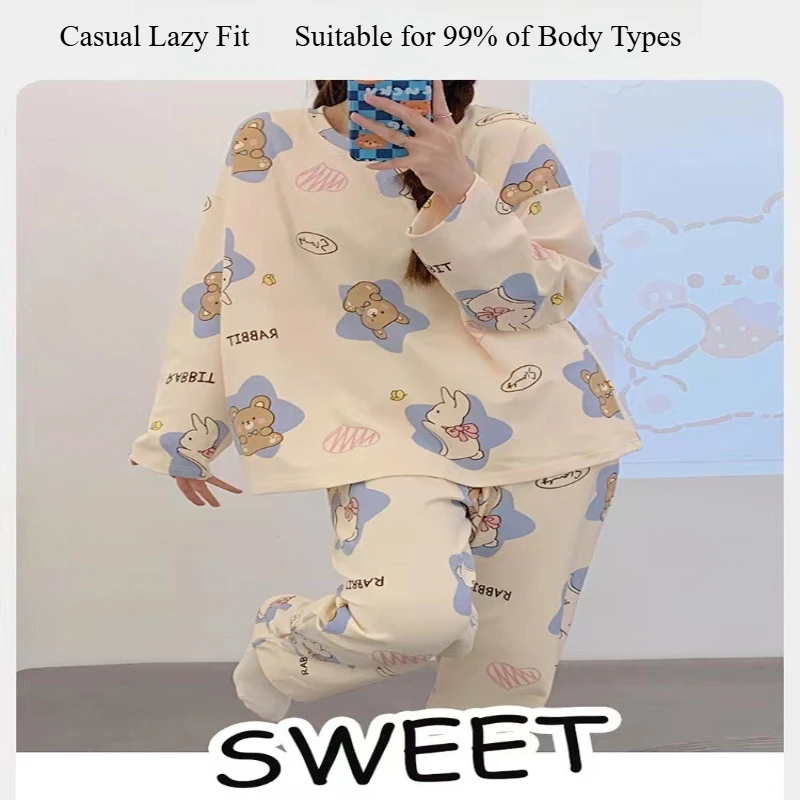 Women's Pajama Set for Spring & Autumn - Long Sleeve & Long Pant, Cute Cartoon Animal Print, Sweet Style for Home & Outdoor Wear